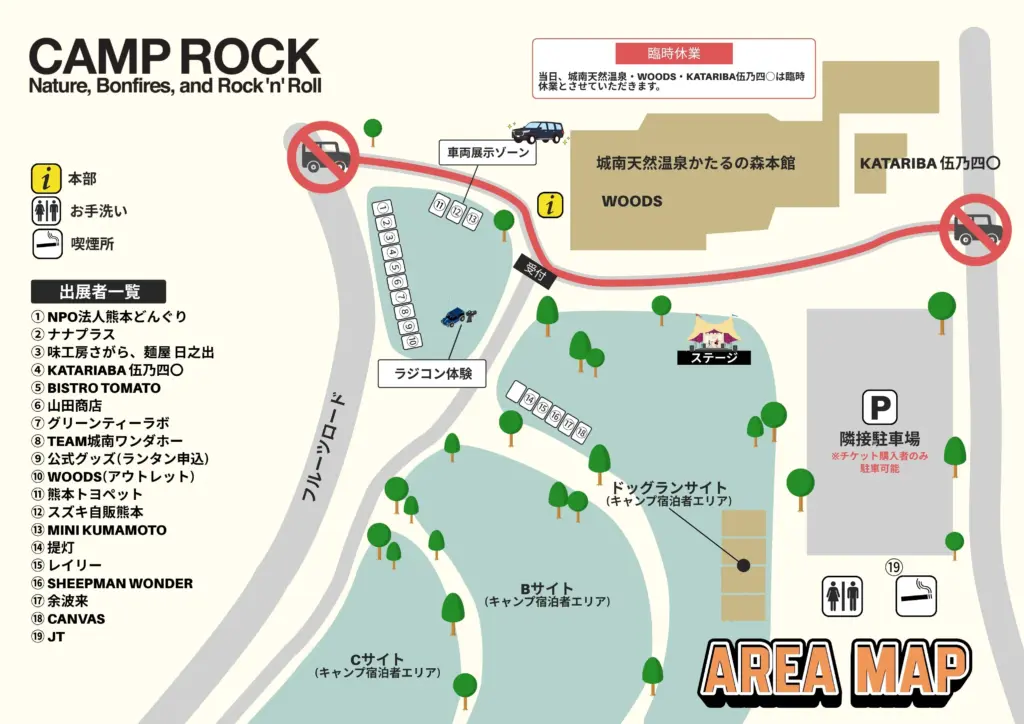NPO法人熊本どんぐり/ CANVAS/ナナプラス/味工房さがら、麺屋 日之出/KATARIBA 伍乃四〇/BISTRO TOMATO/余波来/山田商店/グリーンティーラボ/SHEEPMAN WONDER/熊本トヨペット/スズキ自販熊本/MINI KUMAMOTO/TEAM城南ワンダホー/WOODS(アウトレット)/提灯/レイリー/JT